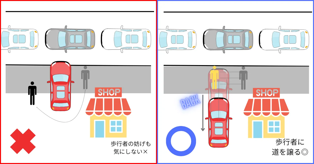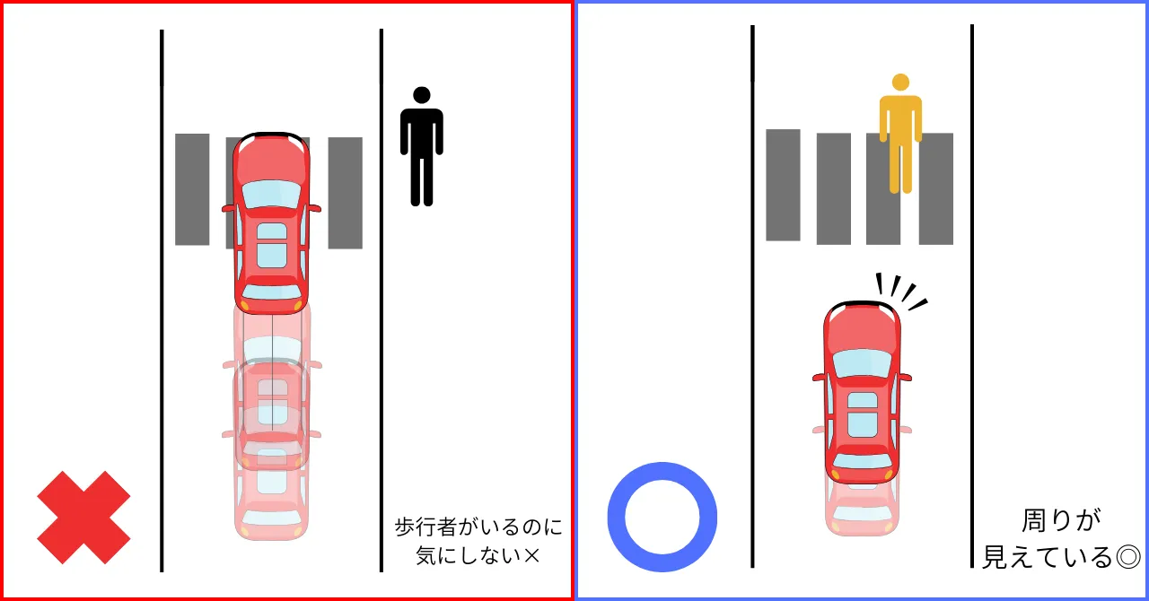 さらに差がつくポイント: 駐車場や狭い道から大通りへ合流する際、歩道上で一時停止してタイミングを計ることがありますよね。そのとき横から歩行者が歩いてきたら、わざわざバックして歩行者の通行を妨げないようにする。