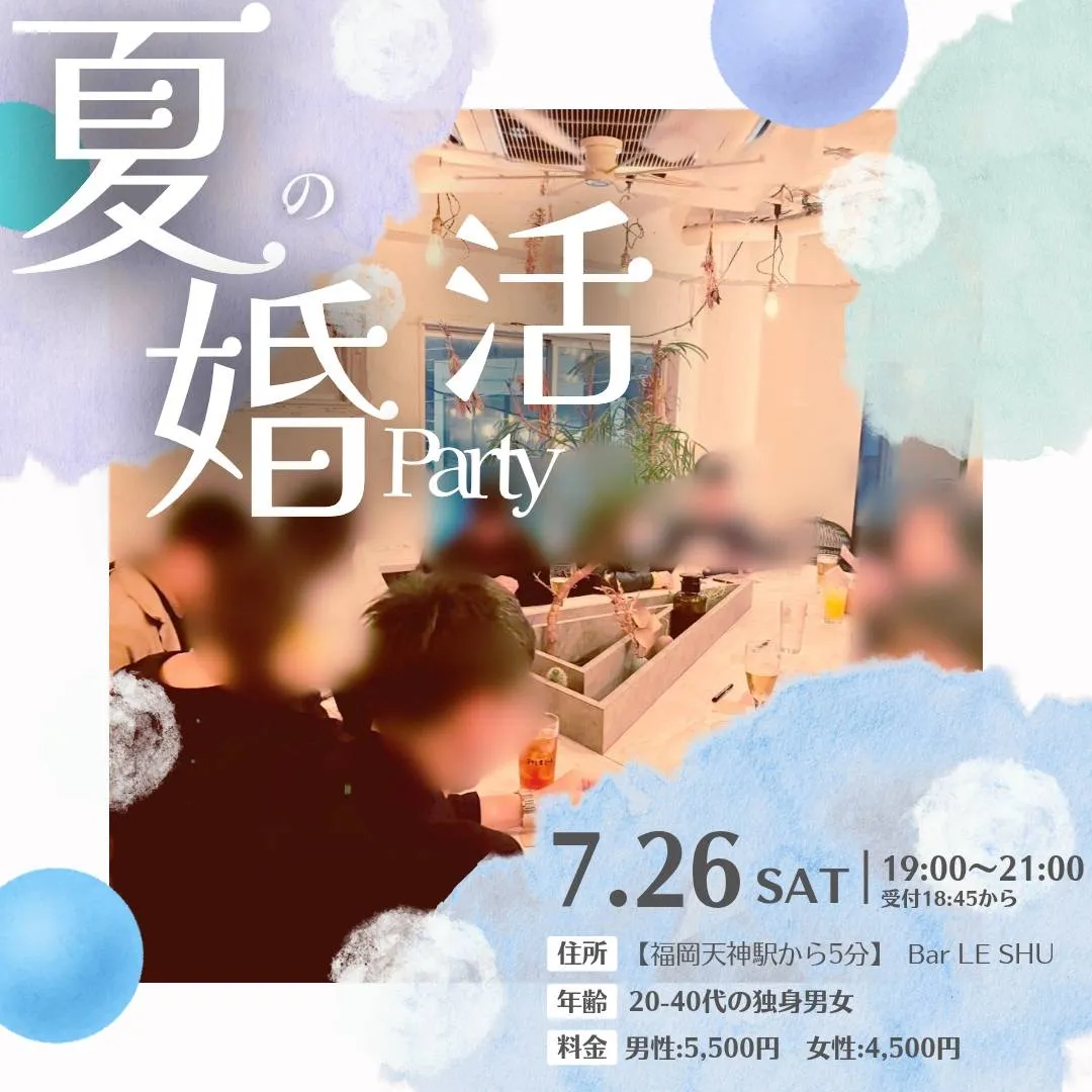 ~夏の婚活パーティ~ こんにちは、結婚相談所tenishia福岡です 7月の婚活パーティのご案内です 大好評につき5月にも開催した場所にてまたまた開催しちゃいます 貸切BARで伸び伸びと出会いを楽しみまし…